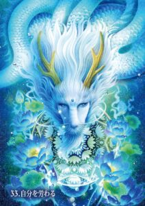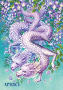 オラクルカードの裏面は、カラフルなカードを引き立てるため、シンプルな色使いでまとめられています。2頭の優しい龍神が手を取り合う姿には友愛が、背景の渦巻きや世界樹をモチーフにした装飾には、永遠と再生の意味が込められています。